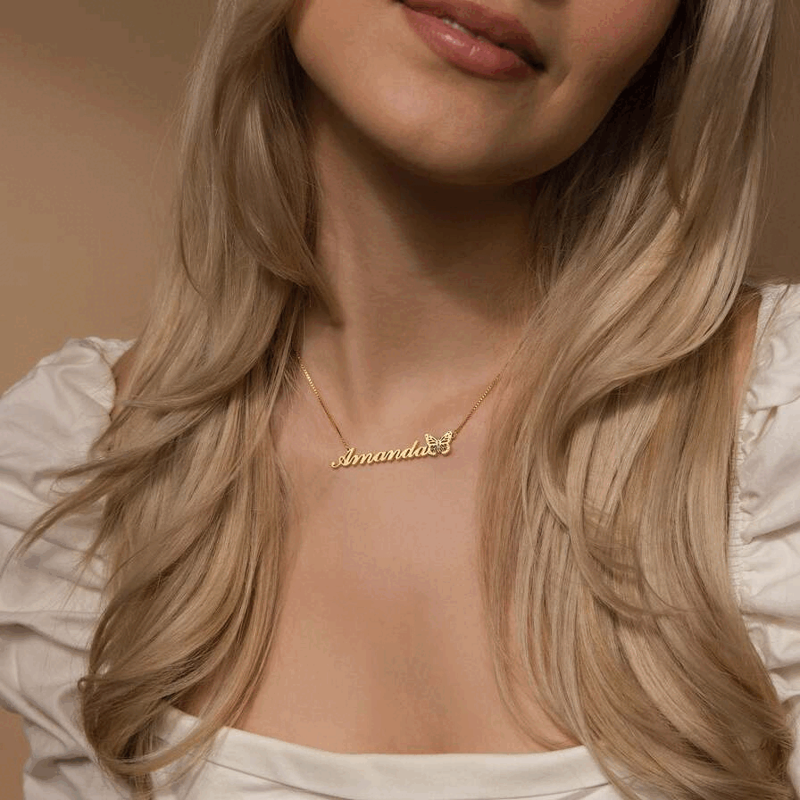 Add a sprinkle of magic to your look with the Elegant Butterfly Name Necklace. This piece combines timeless elegance with a personal touch, making it a perfect statement accessory for any occasion.